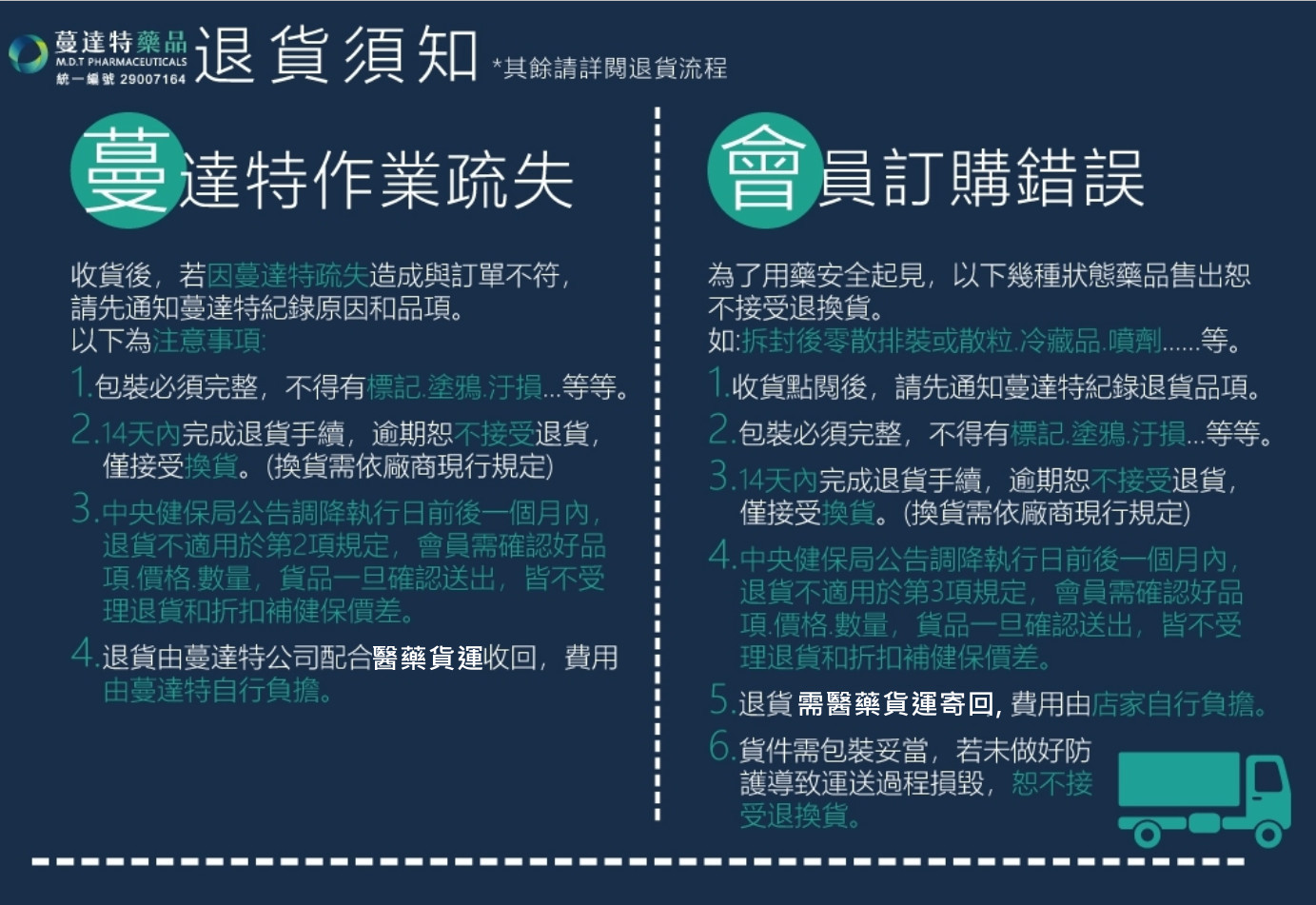 退貨流程怎麼做 發布日期:2022-01-01 瀏覽人次:3004 為了確保用藥安全及品質穩定。以下產品除誤寄以外,恕不接受退換。 冷藏產品 非完整包裝 委託指定代訂產品 噴劑、吸入劑 輸液(注射液) \ 相關圖片 2024-12-23_182930.png 退貨須知.jpg BACK