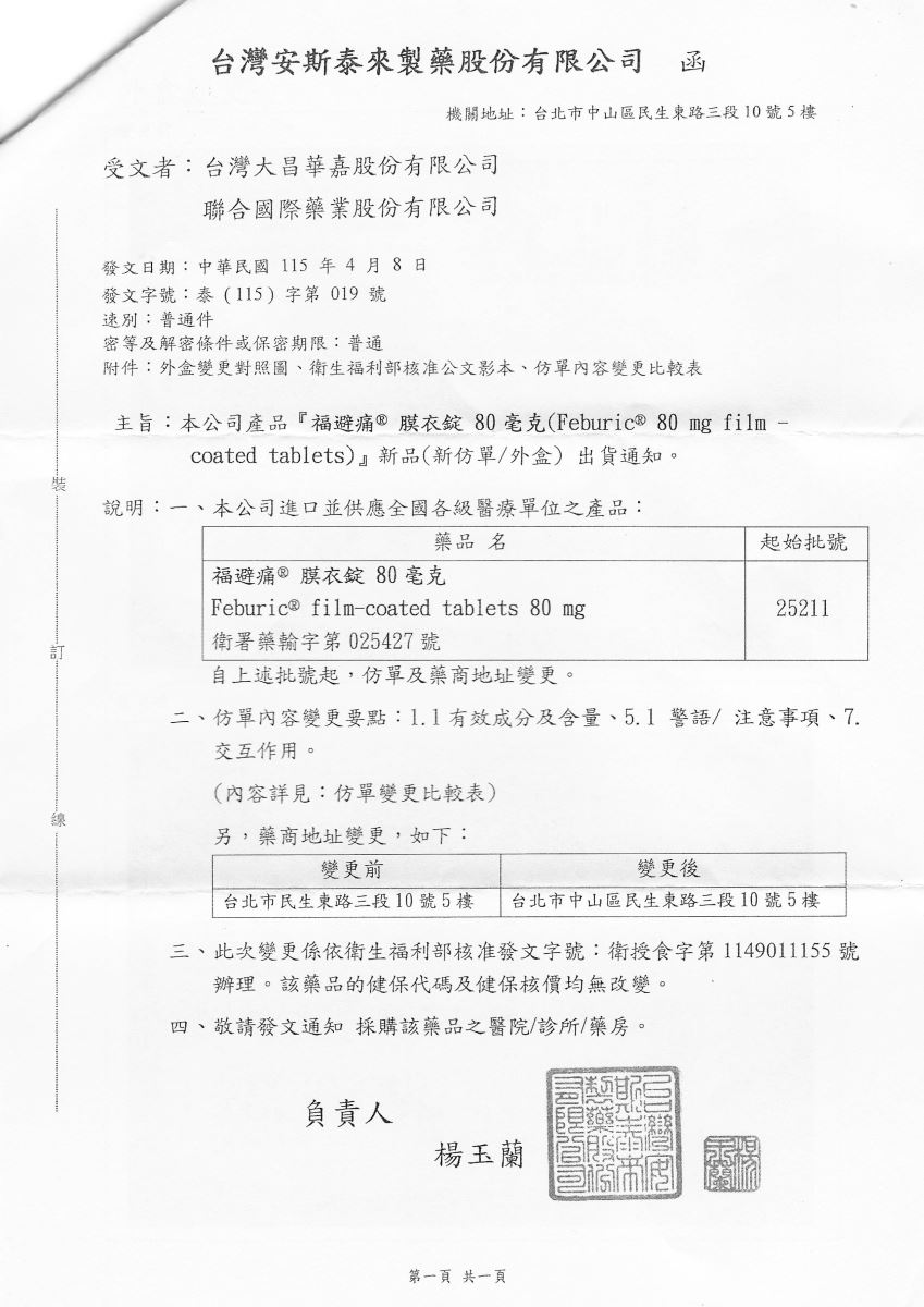 【仿單變更-安斯泰來】福避痛膜衣錠 80MG 28T/盒 發布日期:2026-04-17 瀏覽人次:25 相關圖片 福避痛仿單變更-安斯泰來.jpg 附件檔案 檔案名稱 檔案大小 更新日期 下載檔案 福避痛仿單變更-大昌華嘉.pdf 511KB 2026-04-17 pdf 福避痛仿單變更-安斯泰來.pdf 613KB 2026-04-17 pdf BACK