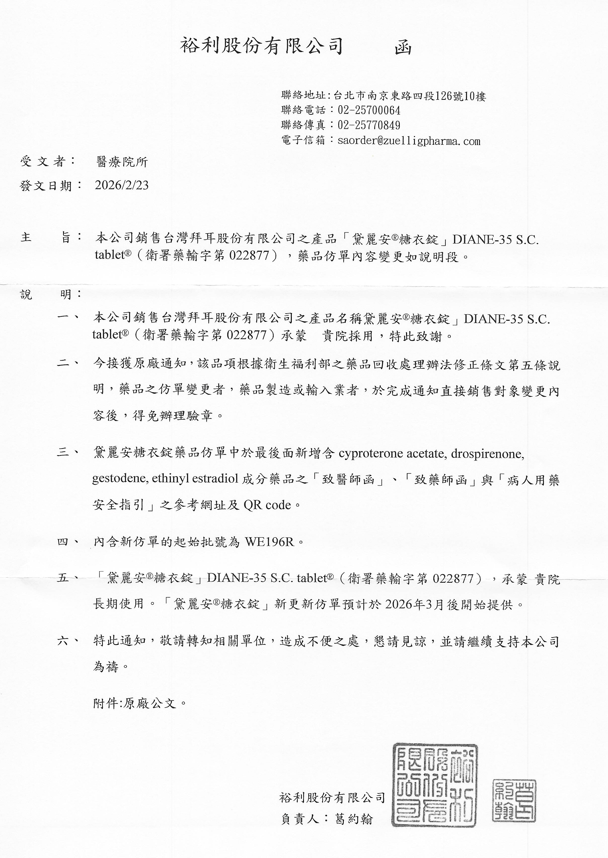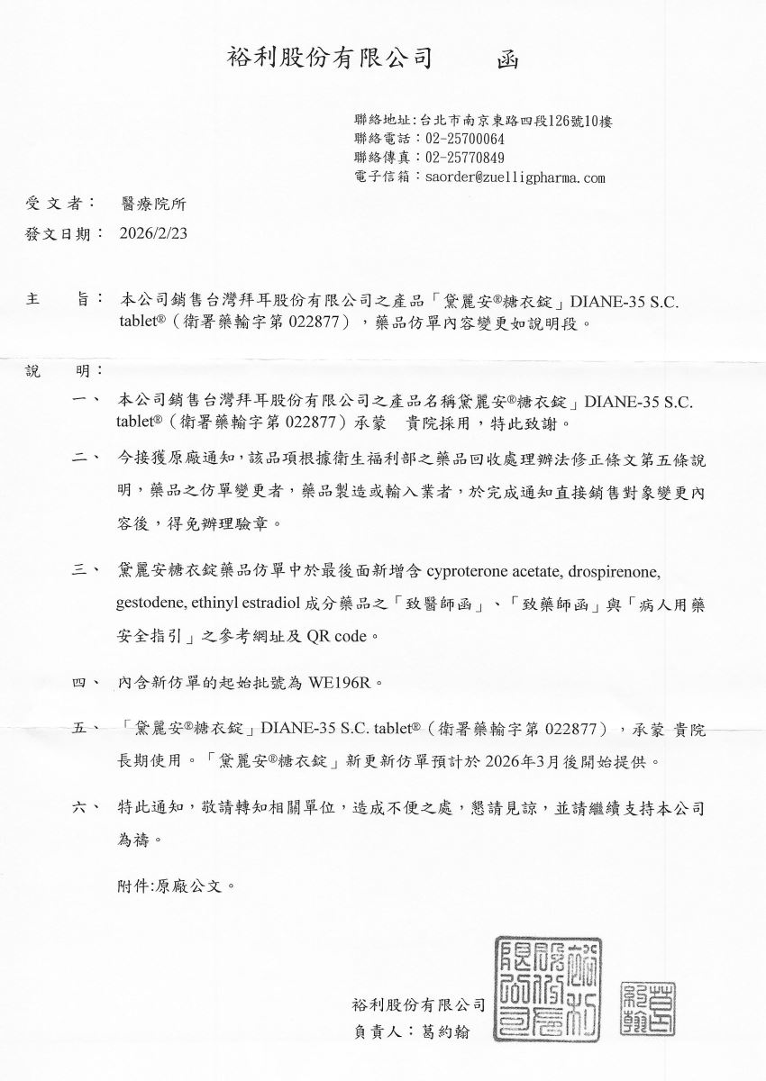 【仿單變更-拜耳】黛麗安糖衣錠 21T/盒 發布日期:2026-03-06 瀏覽人次:3 相關圖片 黛麗安仿單變更-裕利公文.jpg 附件檔案 檔案名稱 檔案大小 更新日期 下載檔案 黛麗安仿單變更-拜耳公文.pdf 415KB 2026-03-06 pdf 黛麗安仿單變更-裕利公文.pdf 602KB 2026-03-06 pdf BACK