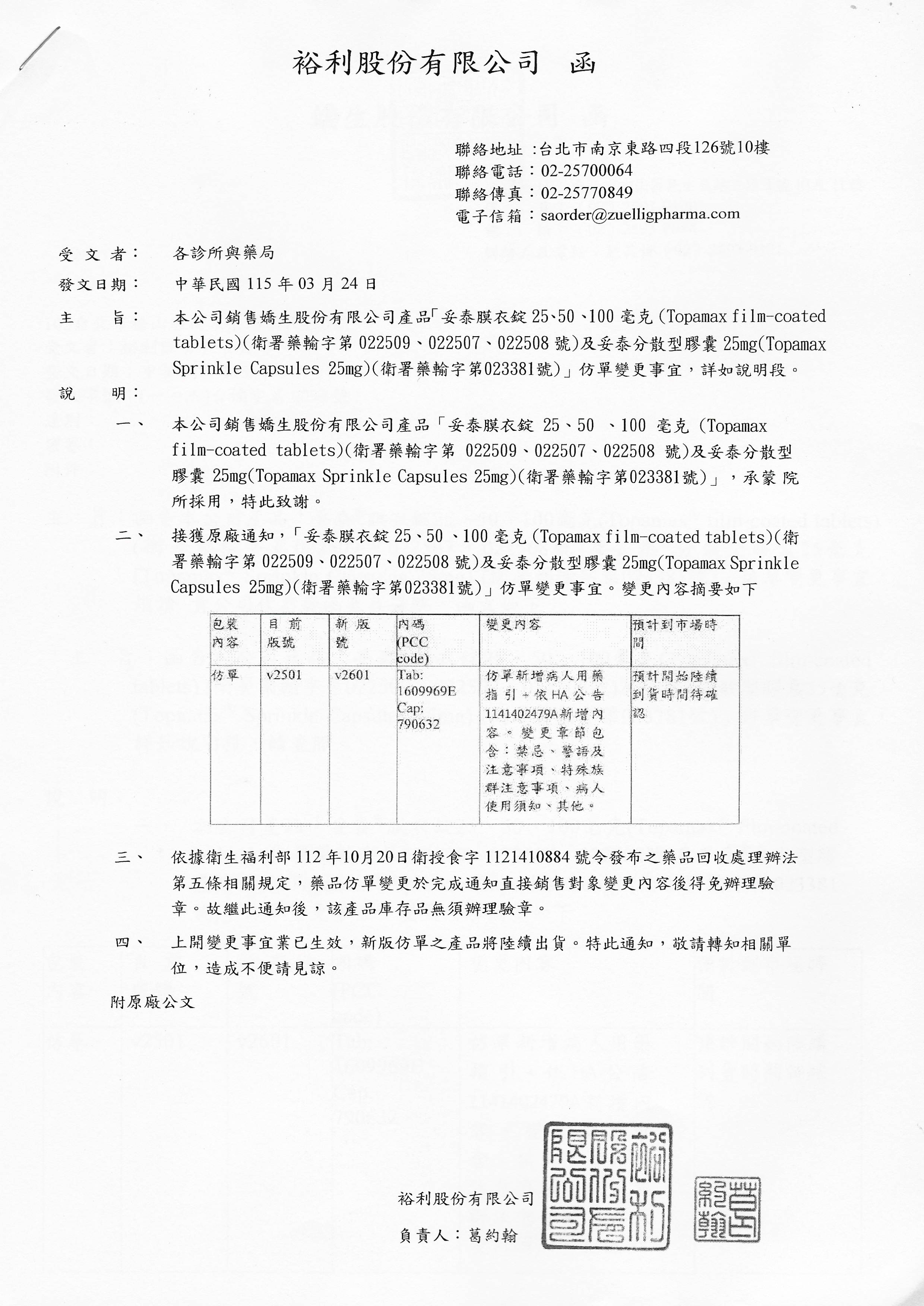 【仿單變更-嬌生】妥泰膜衣錠25、50、100MG系列 發布日期:2026-03-31 瀏覽人次:42 相關圖片 妥泰系列仿單變更-裕利公文.jpg 附件檔案 檔案名稱 檔案大小 更新日期 下載檔案 妥泰系列仿單變更-嬌生公文.pdf 1158KB 2026-03-31 pdf 妥泰系列仿單變更-裕利公文.pdf 644KB 2026-03-31 pdf BACK