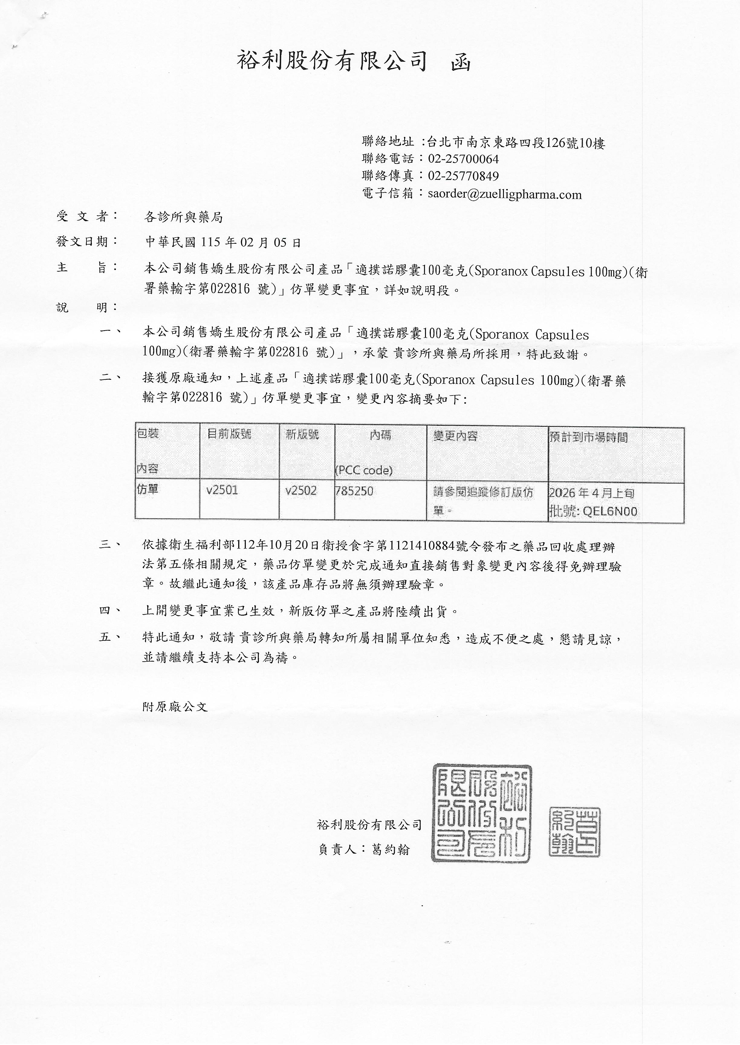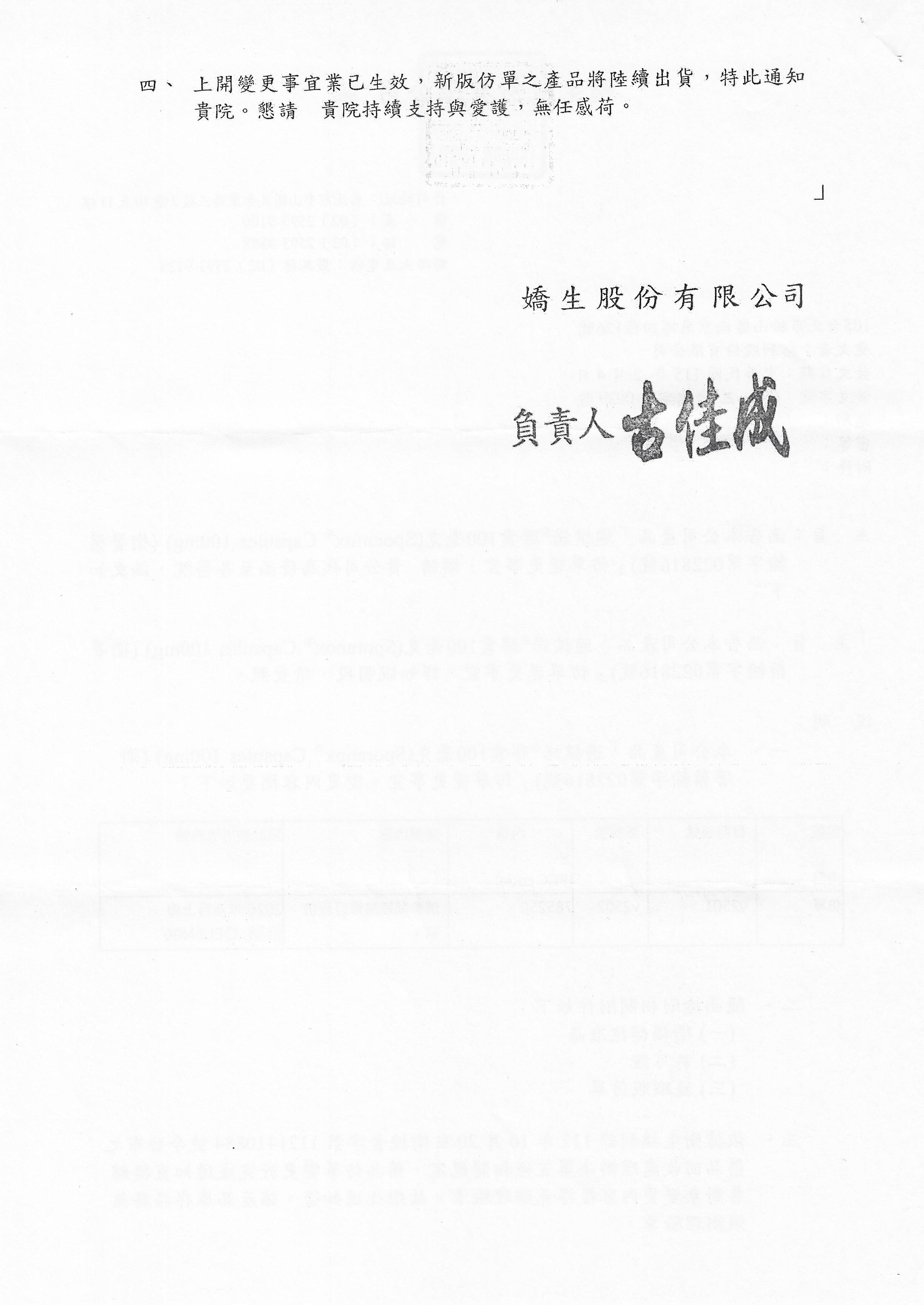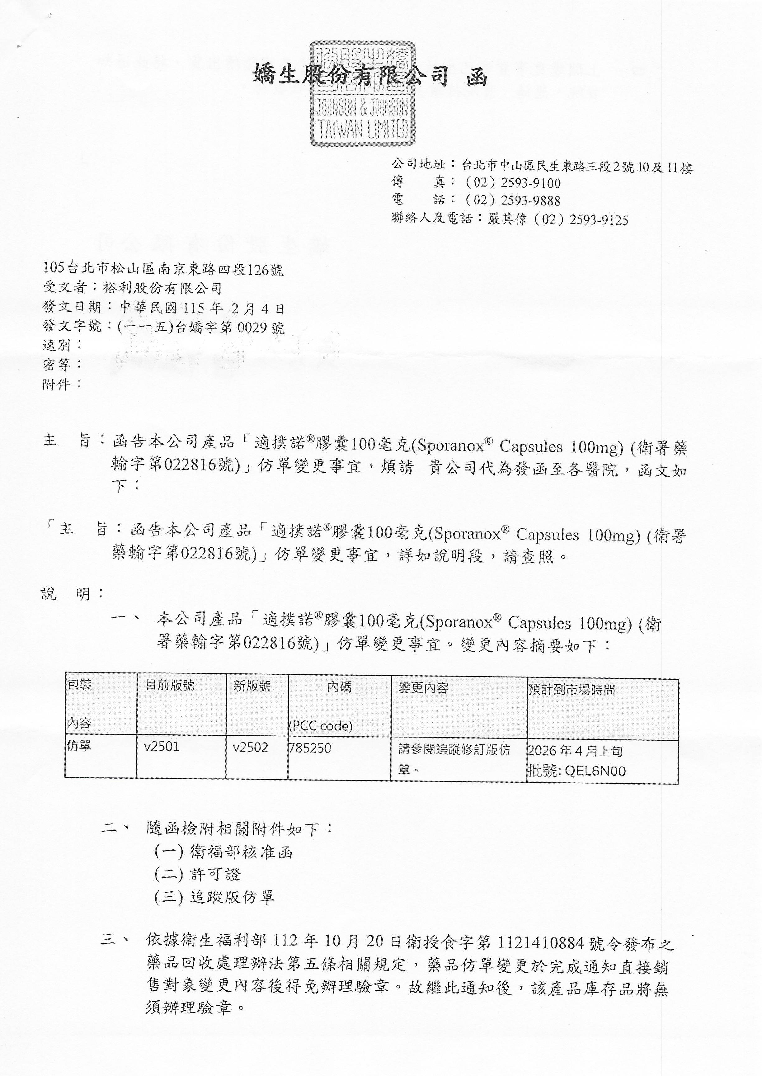 【仿單變更-嬌生】適撲諾膠囊 100MG 56T/盒 發布日期:2026-02-24 瀏覽人次:34 相關圖片 適撲諾膠囊 100MG-變更仿單-嬌生公文1.jpg 適撲諾膠囊 100MG-變更仿單-嬌生公文2.jpg 適撲諾膠囊 100MG-變更仿單-裕利公文.jpg 附件檔案 檔案名稱 檔案大小 更新日期 下載檔案 適撲諾膠囊 100MG-變更仿單-嬌生公文.pdf 1057KB 2026-02-24 pdf BACK