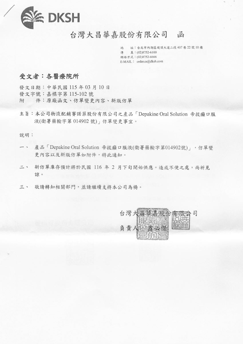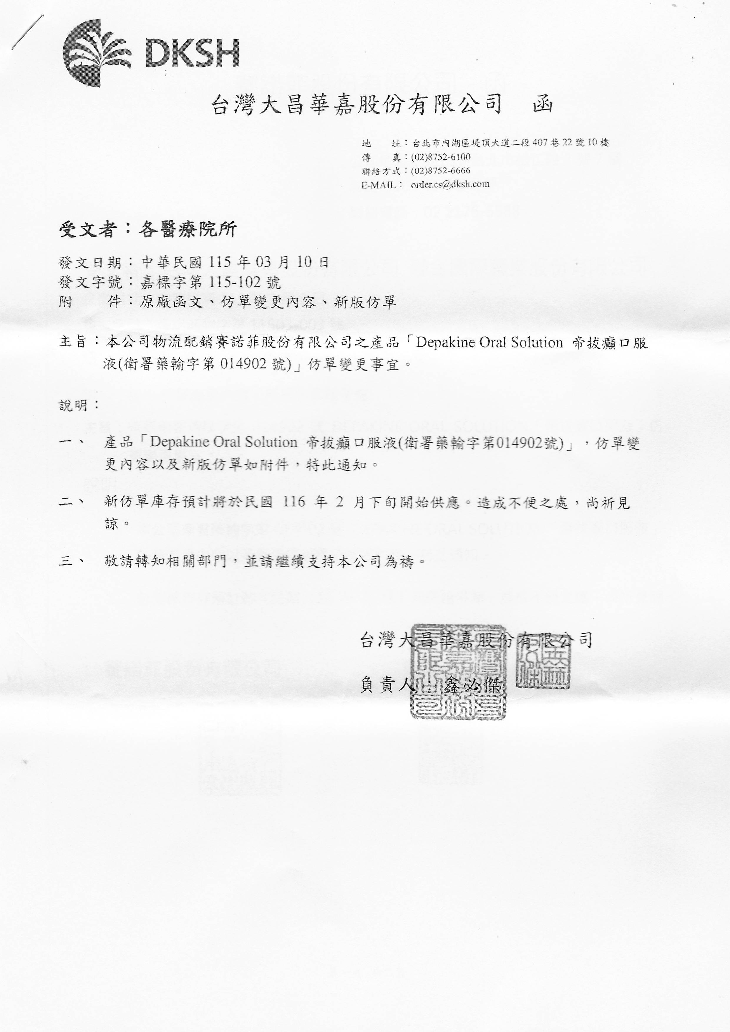 【仿單變更-賽諾菲】帝拔癲口服液 200MG 40ML/瓶 發布日期:2026-03-13 瀏覽人次:15 相關圖片 帝拔癲口服液 200MG變更仿單-大昌華嘉公文.jpg 附件檔案 檔案名稱 檔案大小 更新日期 下載檔案 帝拔癲口服液 200MG變更仿單-大昌華嘉公文.pdf 380KB 2026-03-13 pdf 帝拔癲口服液 200MG變更仿單-賽諾菲公文.pdf 388KB 2026-03-13 pdf BACK