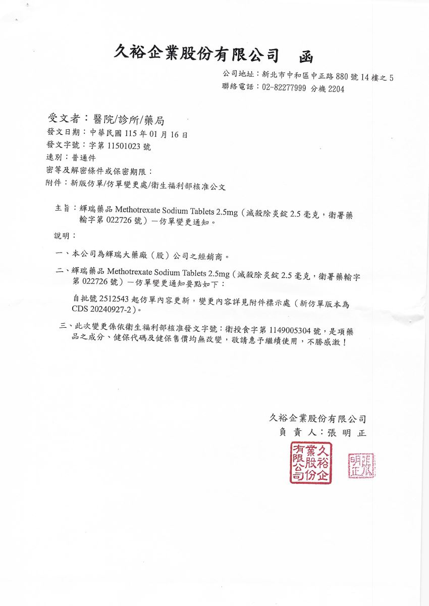 【仿單變更-輝瑞】滅殺除炎錠 2.5MG 100T 發布日期:2026-01-26 瀏覽人次:10 相關圖片 滅殺除炎錠 2.5MG 100T-仿單變更.jpg 附件檔案 檔案名稱 檔案大小 更新日期 下載檔案 滅殺除炎錠 2.5MG 100T-仿單變更.pdf 375KB 2026-01-26 pdf 滅殺除炎錠 2.5MG 100T-仿單變更-輝瑞.pdf 706KB 2026-01-26 pdf BACK