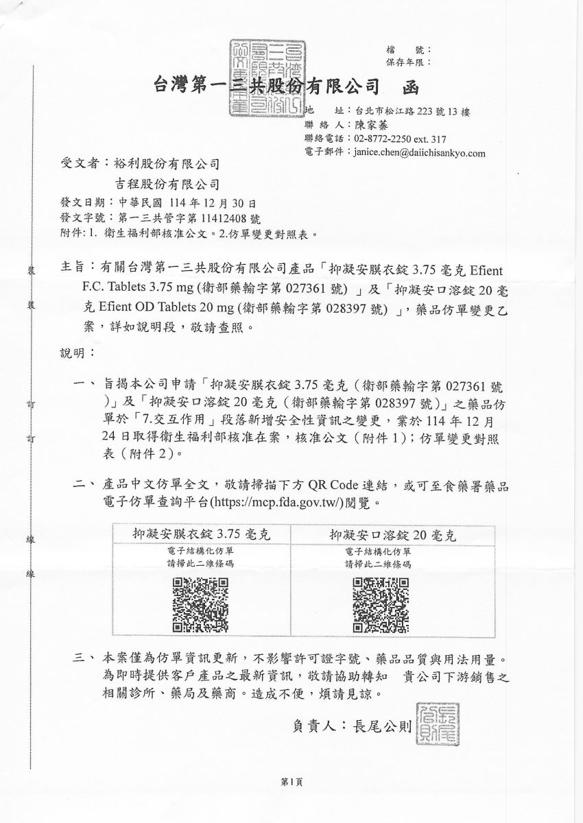 【仿單變更-第一三共】抑凝安膜衣錠 3.75MG 28T/盒 發布日期:2026-01-26 瀏覽人次:11 相關圖片 抑凝安膜衣錠 3.75MG 28T盒.jpg 附件檔案 檔案名稱 檔案大小 更新日期 下載檔案 抑凝安膜衣錠 3.75MG 28T盒-公文.pdf 559KB 2026-01-26 pdf 抑凝安膜衣錠 3.75MG 28T盒-仿單.pdf 1096KB 2026-01-26 pdf 抑凝安膜衣錠 3.75MG 28T盒-第一三共.pdf 778KB 2026-01-26 pdf 抑凝安膜衣錠 3.75MG-變更仿單-裕利.pdf 689KB 2026-01-26 pdf BACK