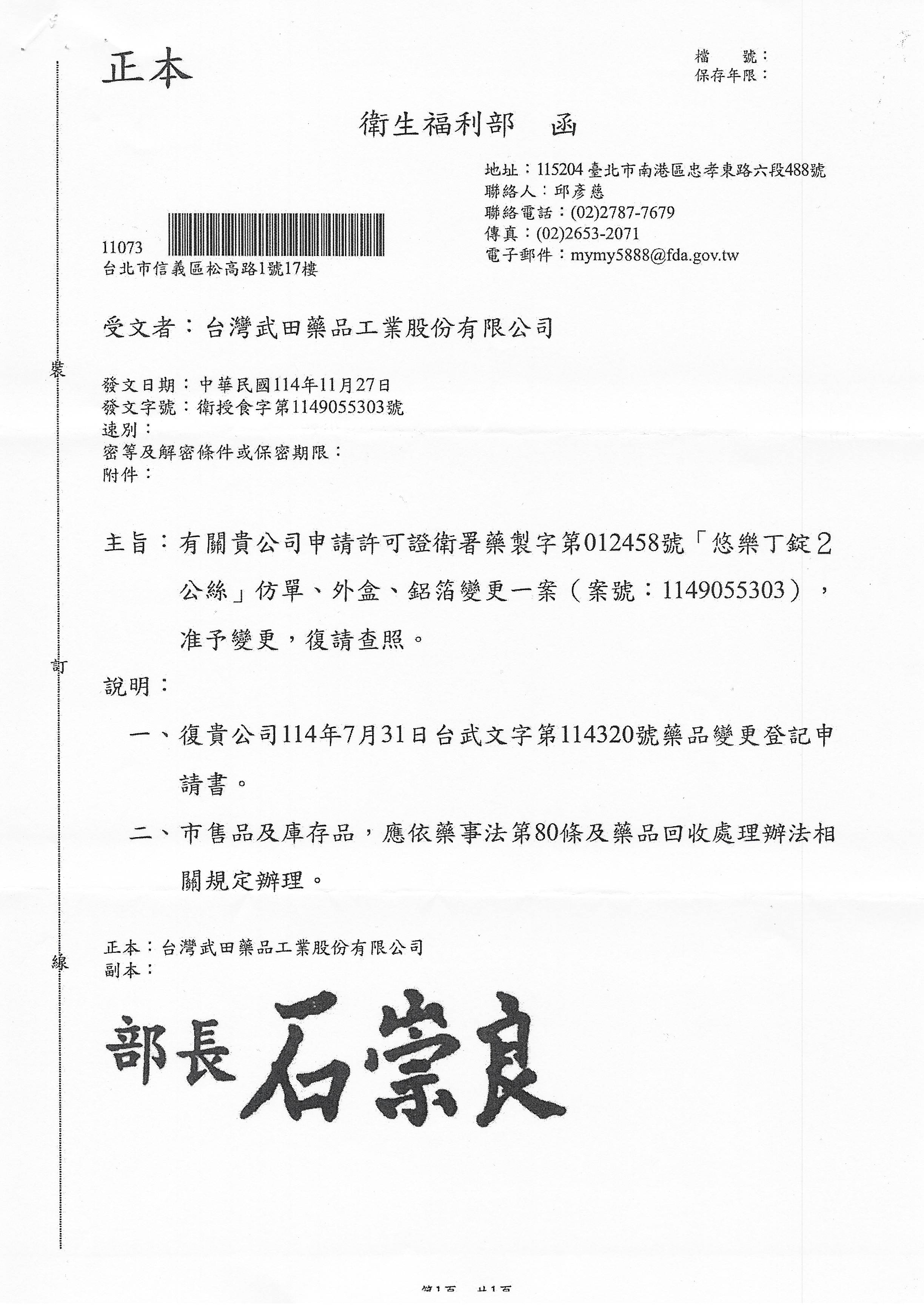 【仿單+包裝變更-武田】悠樂丁錠 2MG 100T(10'S*10'P)/盒 發布日期:2026-02-03 瀏覽人次:56 相關圖片 悠樂丁-仿單.外盒變更公文.jpg 附件檔案 檔案名稱 檔案大小 更新日期 下載檔案 悠樂丁-仿單.外盒變更公文.pdf 609KB 2026-02-03 pdf 悠樂丁-仿單.外盒變更公文2.pdf 1339KB 2026-02-03 pdf 悠樂丁-仿單.外盒變更公文-裕利.pdf 609KB 2026-02-03 pdf 悠樂丁-仿單.pdf 2442KB 2026-02-03 pdf BACK