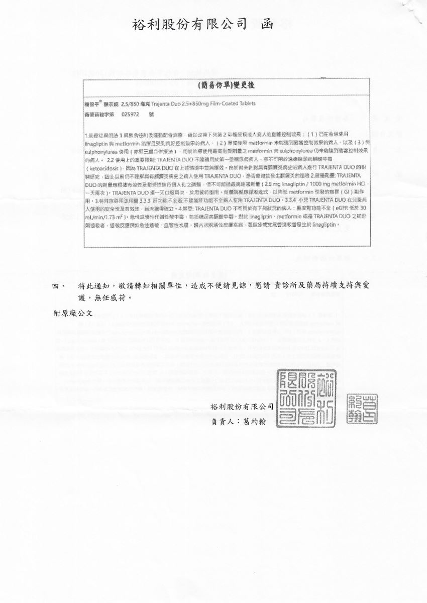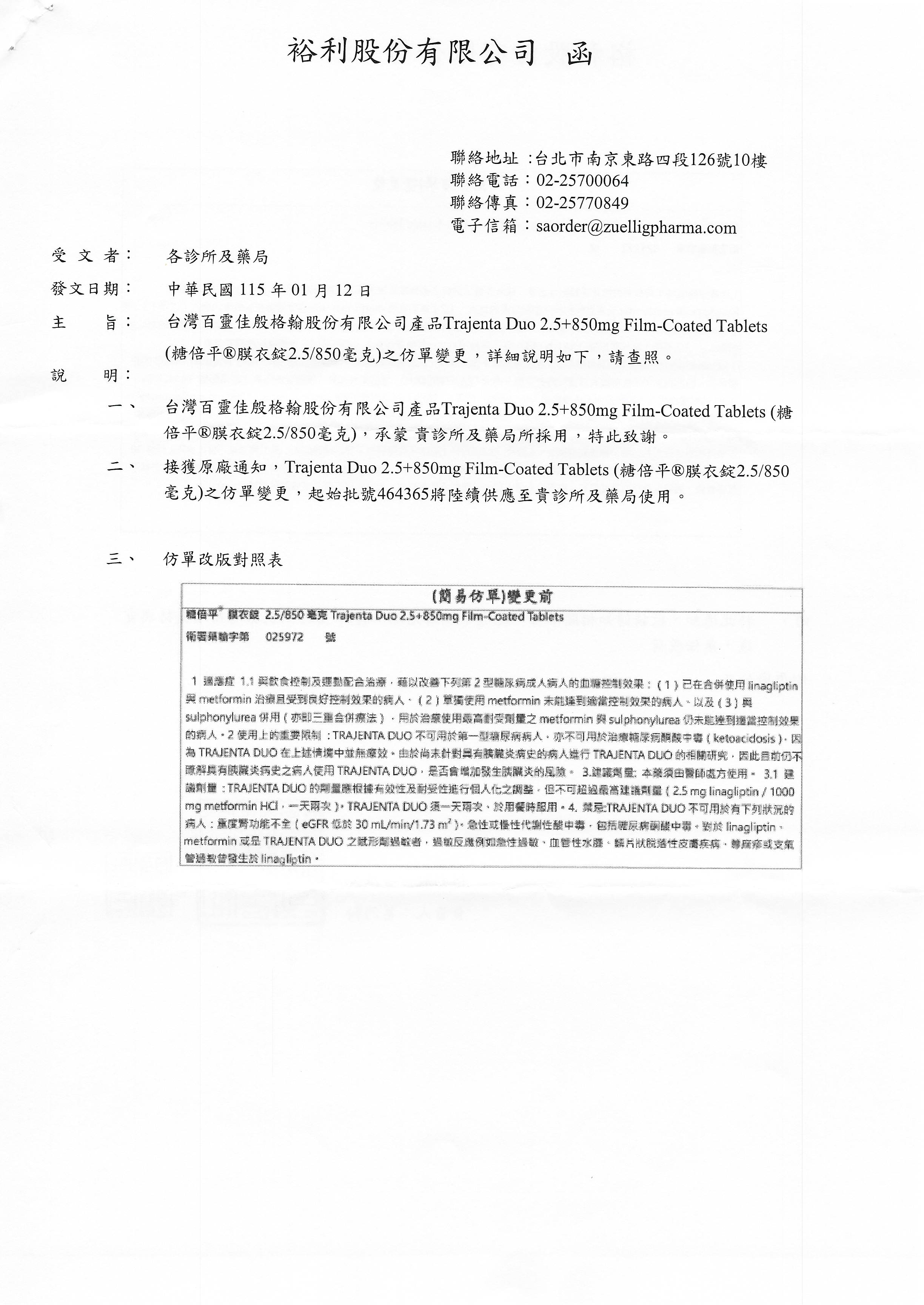 【仿單變更-百靈佳】糖倍平膜衣錠 2.5/850MG 60T/盒 發布日期:2026-01-27 瀏覽人次:9 相關圖片 糖倍平-變更仿單-裕利公文.jpg 糖倍平-變更仿單-裕利公文2.jpg 附件檔案 檔案名稱 檔案大小 更新日期 下載檔案 糖倍平-變更仿單-裕利.pdf 1165KB 2026-01-27 pdf BACK