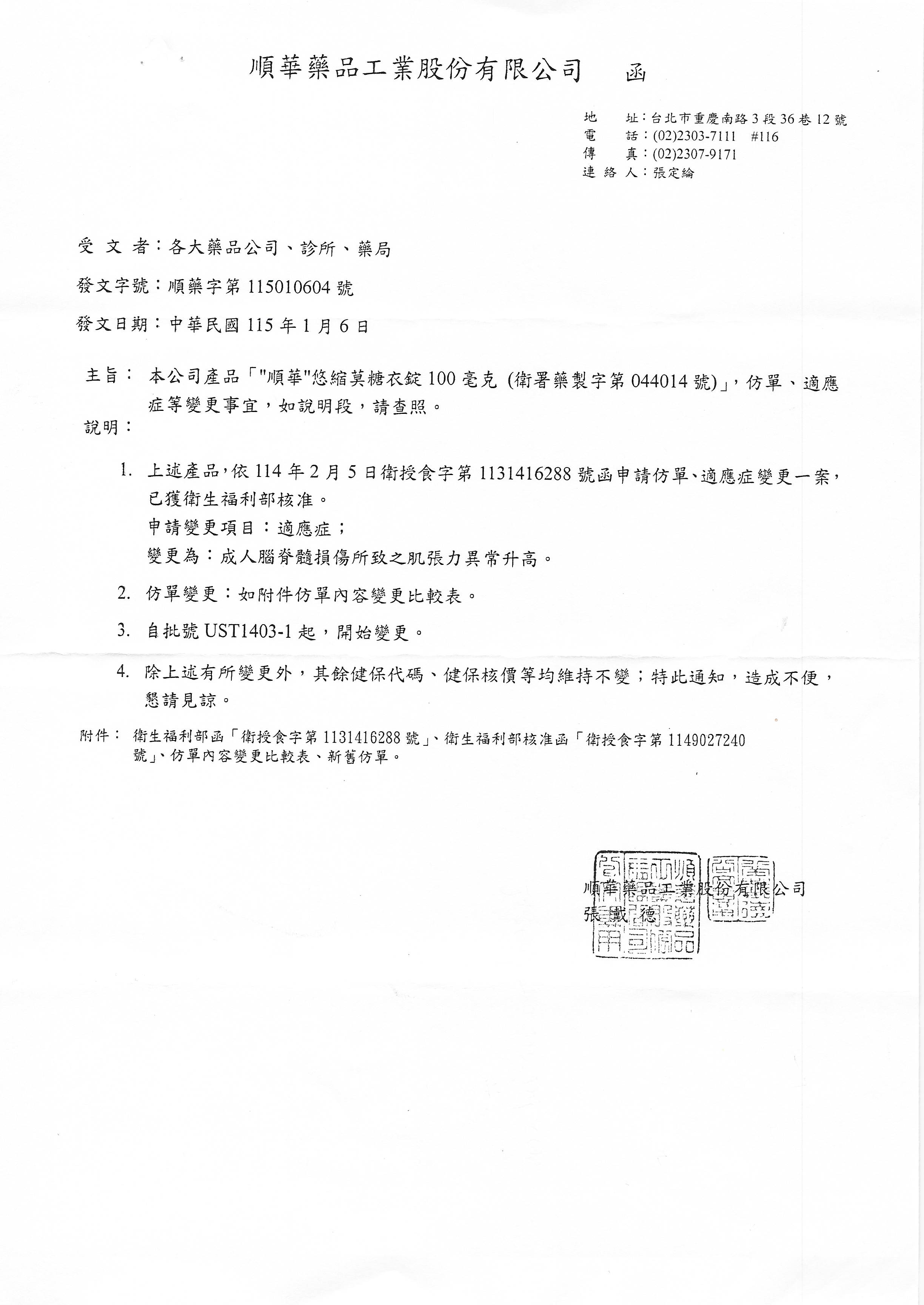 【仿單+適應症變更-順華】悠縮莫糖衣錠 100MG 1000T 發布日期:2026-01-26 瀏覽人次:13 相關圖片 順華 悠縮莫糖衣錠 100MG 1000T-變更仿單+適應症.jpg 附件檔案 檔案名稱 檔案大小 更新日期 下載檔案 順華 悠縮莫糖衣錠 100MG 1000T-新仿單.pdf 1742KB 2026-01-26 pdf 順華 悠縮莫糖衣錠 100MG 1000T-變更仿單+適應症-公文.pdf 349KB 2026-01-26 pdf 順華 悠縮莫糖衣錠 100MG 1000T-變更仿單+適應症-衛福部公文.pdf 358KB 2026-01-26 pdf 順華 悠縮莫糖衣錠 100MG 1000T-變更仿單+適應症-衛福部公文2.pdf 1006KB 2026-01-26 pdf 順華 悠縮莫糖衣錠 100MG 1000T-變更仿單比照表.pdf 2110KB 2026-01-26 pdf BACK