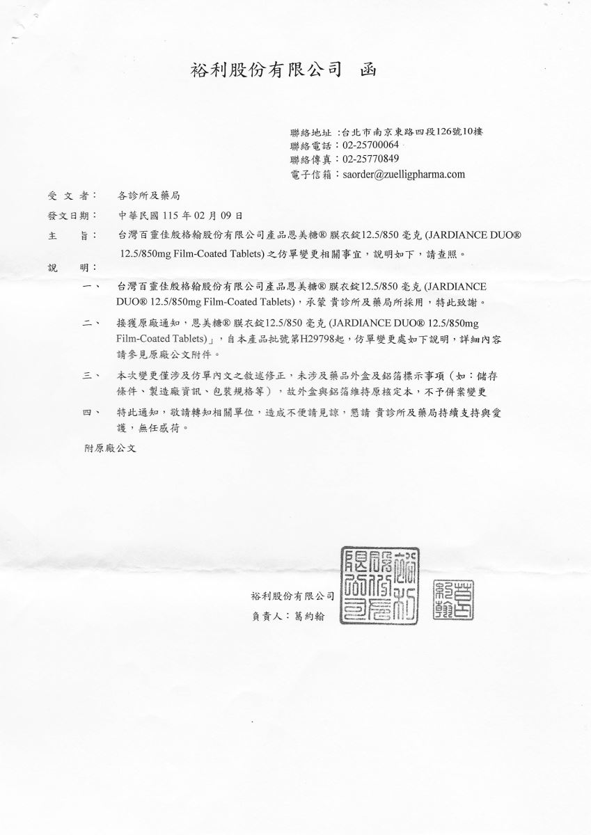 【仿單變更-百靈佳】恩美糖膜衣錠 12.5/850MG 60T/盒 發布日期:2026-02-24 瀏覽人次:35 相關圖片 恩美糖膜衣錠 -變更仿單-裕利公文.jpg 附件檔案 檔案名稱 檔案大小 更新日期 下載檔案 恩美糖膜衣錠 -變更仿單-百靈佳公文.pdf 2218KB 2026-02-24 pdf 恩美糖膜衣錠 -變更仿單-裕利公文.pdf 399KB 2026-02-24 pdf BACK