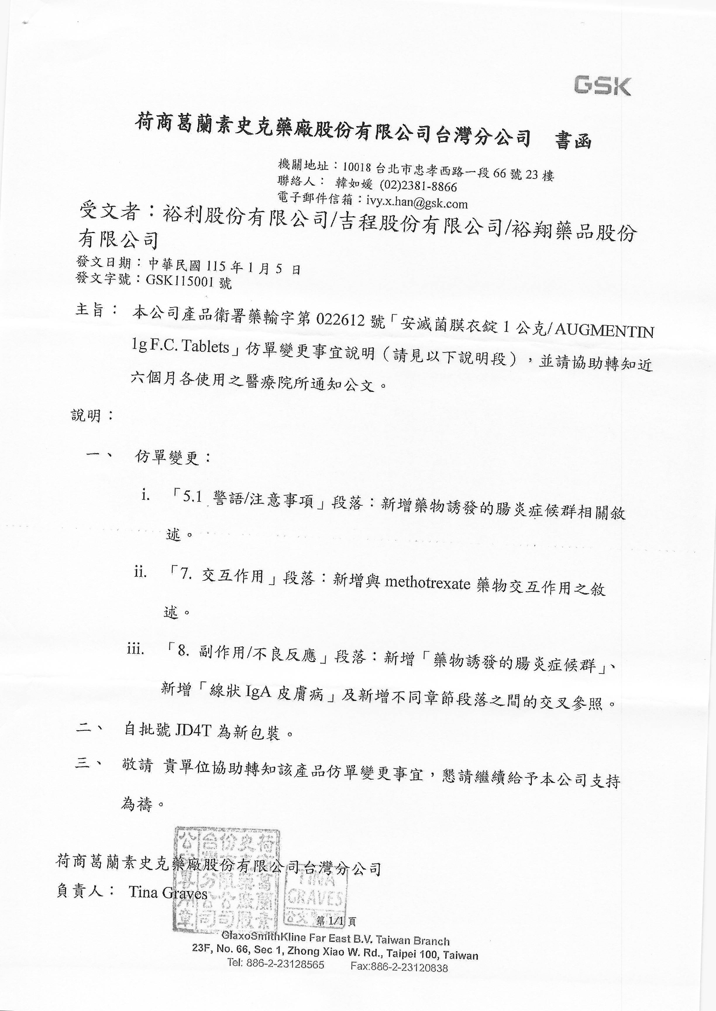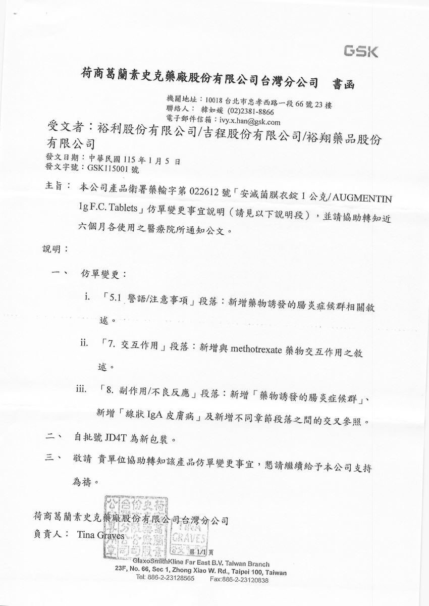 【仿單變更-葛蘭素】安滅菌膜衣錠 1G 10T/盒 發布日期:2026-01-26 瀏覽人次:10 相關圖片 安滅菌膜衣錠 1G 10T盒-仿單變更.jpg 附件檔案 檔案名稱 檔案大小 更新日期 下載檔案 安滅菌膜衣錠 1G 10T盒-仿單變更-葛蘭素.pdf 641KB 2026-01-26 pdf 安滅菌膜衣錠 1G-仿單變更-裕利.pdf 558KB 2026-01-26 pdf BACK